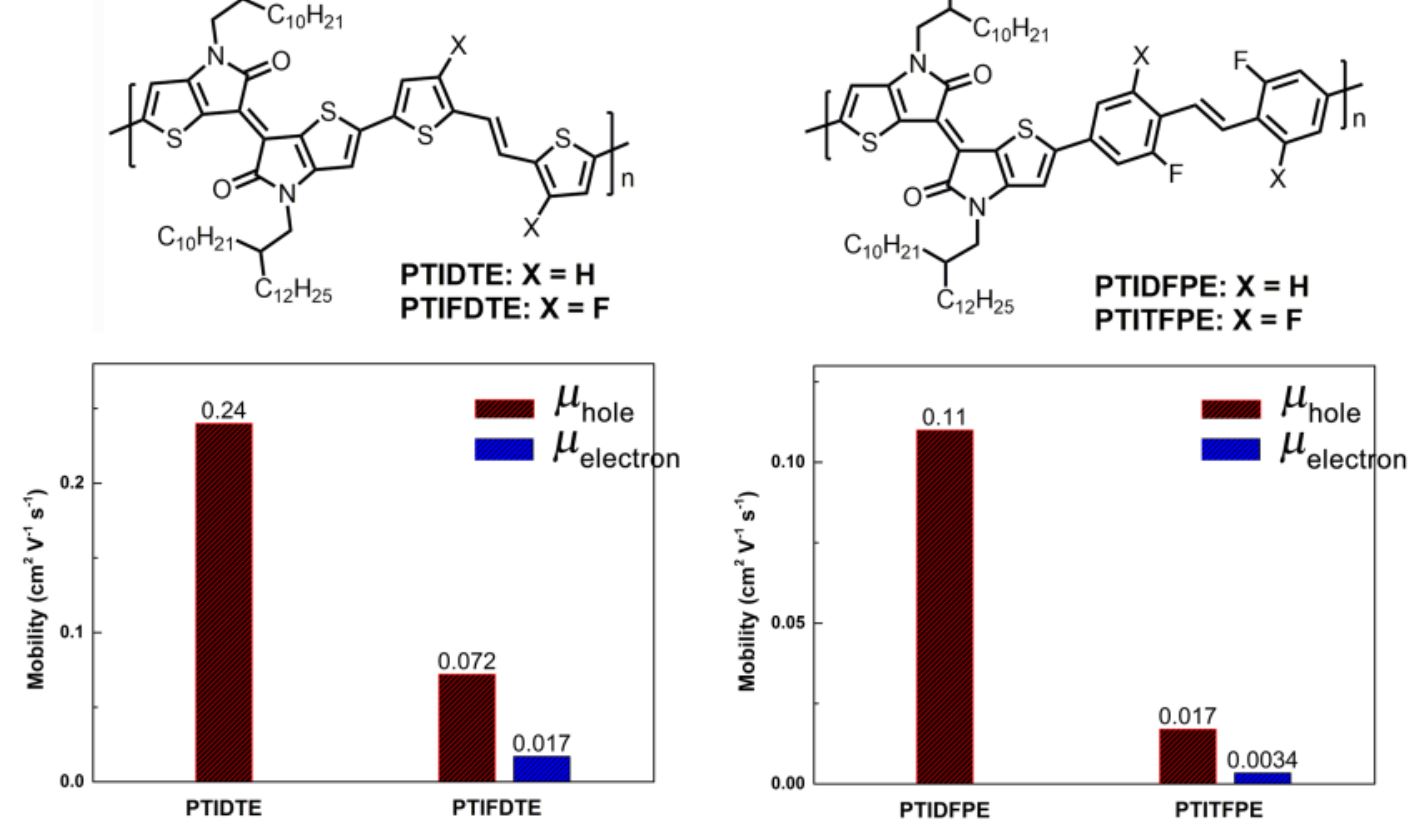 1.Weifeng Zhang, Keli Shi, Congyuan Wei, Yankai Zhou, Liping Wang, * and Gui Yu,* Tuning carrier transport properties of thienoisoindigo-based copolymers by loading fluorine atoms onto the diarylethylene-based electron-donating units, Polymer, 2017, 132, 12‒22.