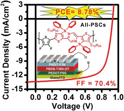 6. Yongchun Li, Huifeng Meng, Tao Liu,* Yiqun Xiao, Zhonghai Tang, Bo Pang, Yuqing Li, Ying Xiang, Guangye Zhang, Xinhui Lu, Gui Yu, He Yan,* Chuanlang Zhan,* Jianhua Huang,* and Jiannian Yao, 8.78% Efficient All-Polymer Solar Cells Enabled by Polymer Acceptors Based on a B←N Embedded Electron-Deficient Unit, Adv. Mater., 2019, 31, 1904585.